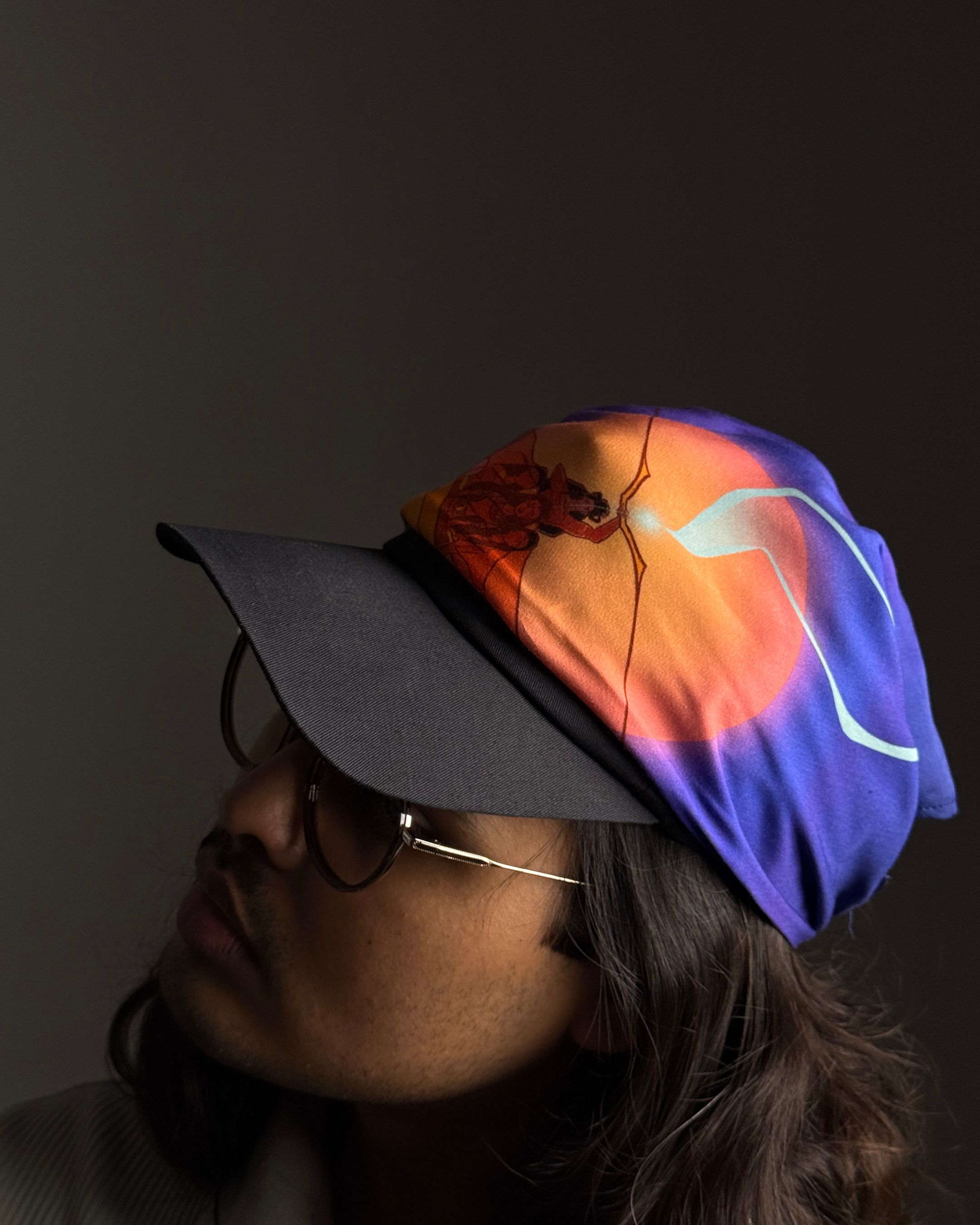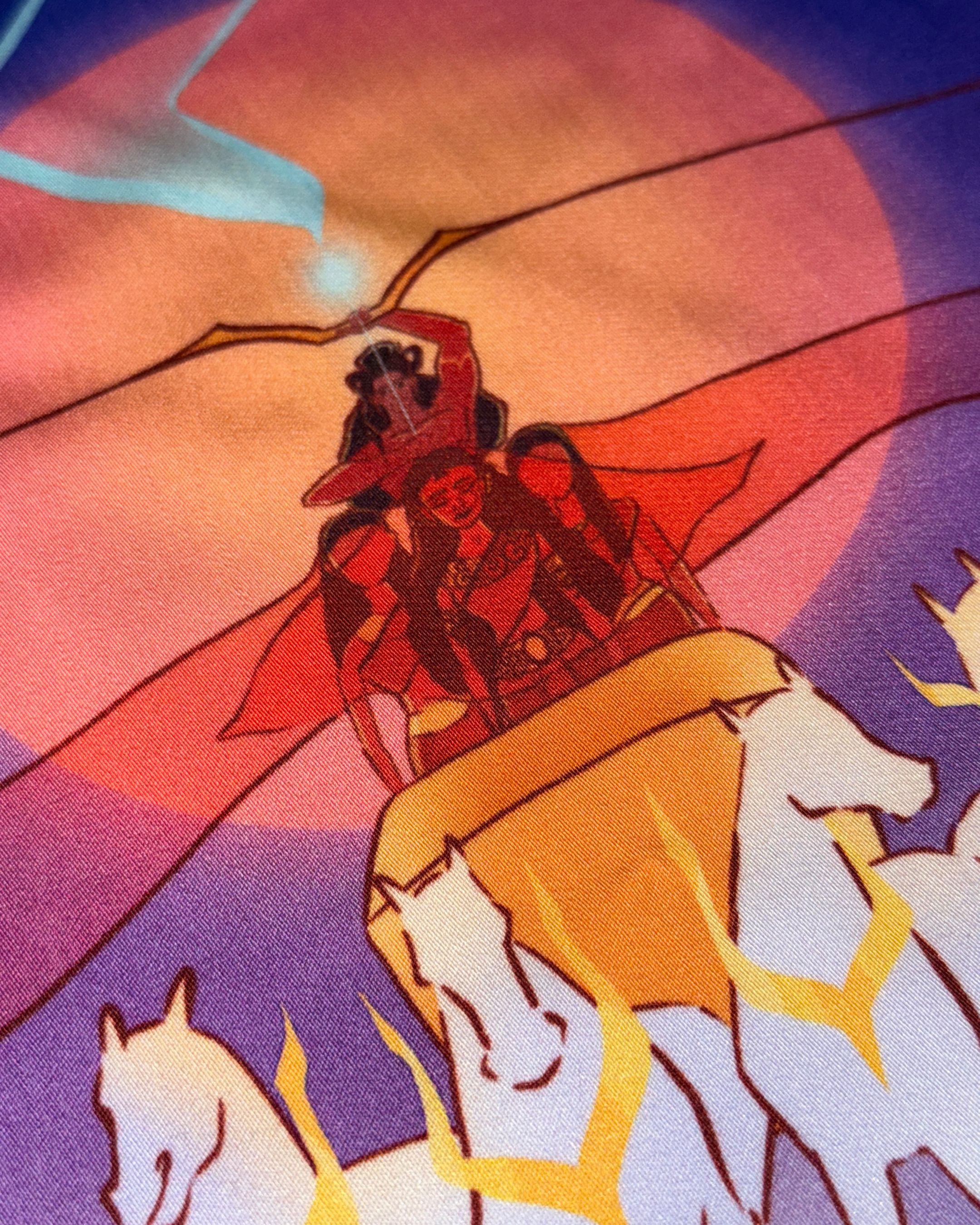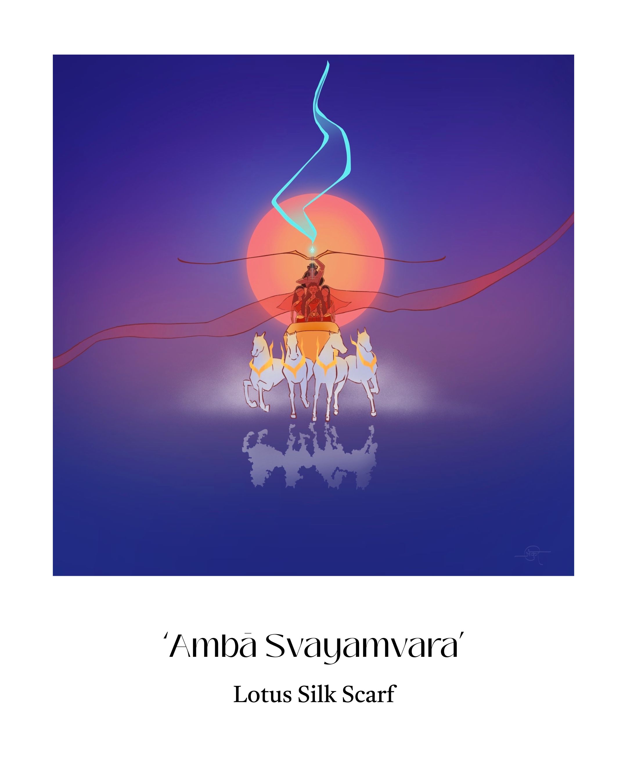 Lotus silk is one of the rarest fabrics in the world. This scarf features an original artwork that depicts Bhīṣma battling kings, with Ambā, Ambikā, and Ambālikā on his chariot.