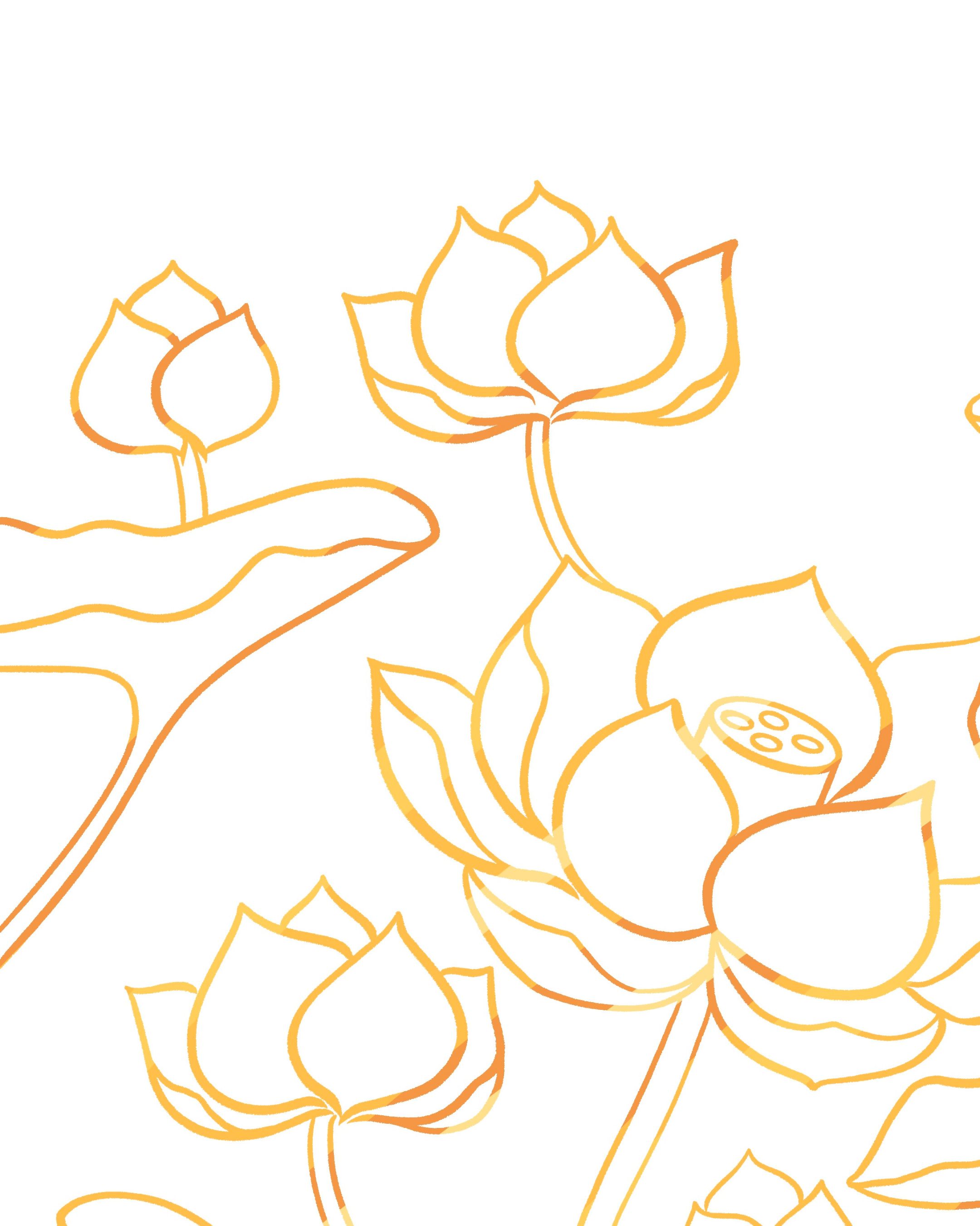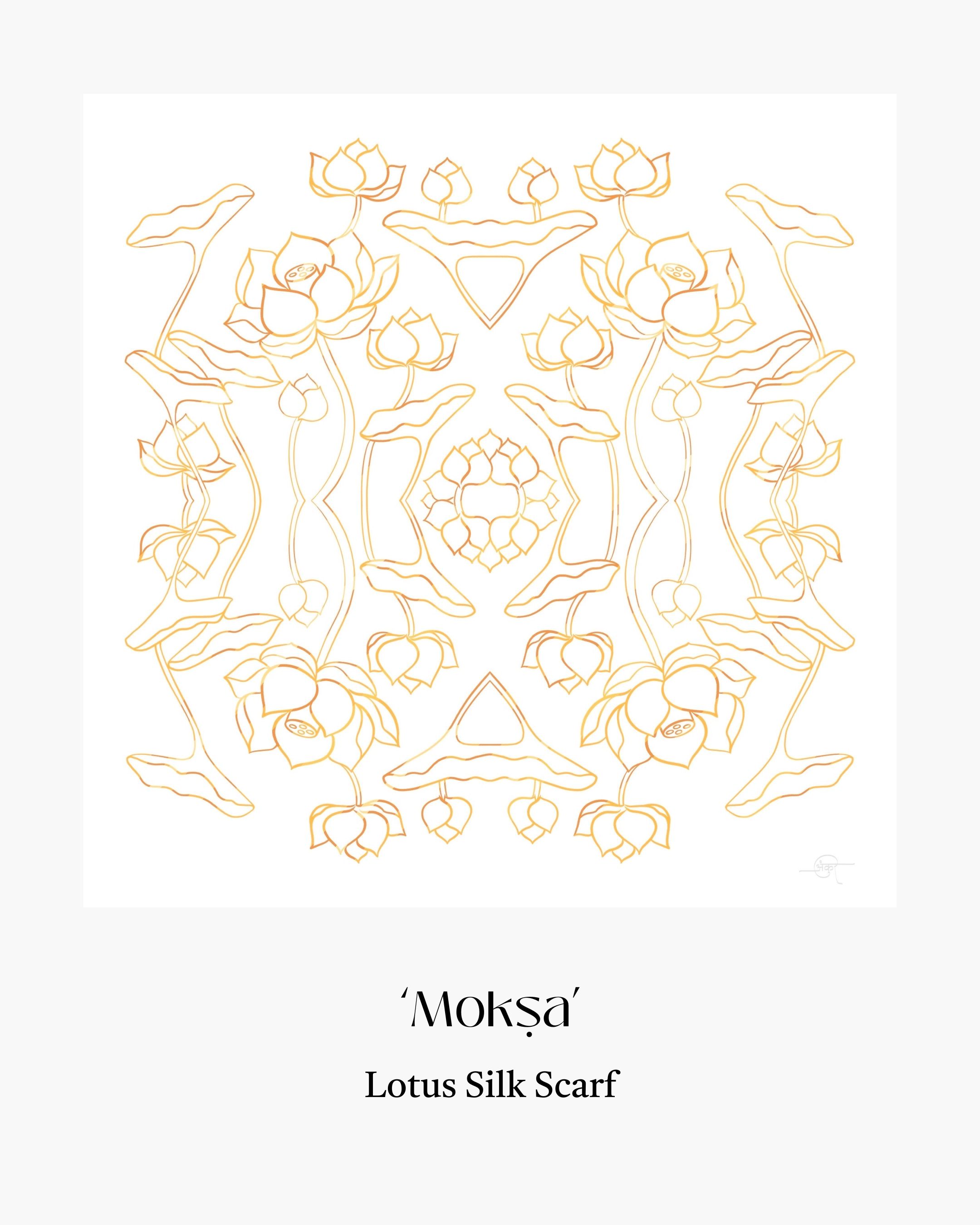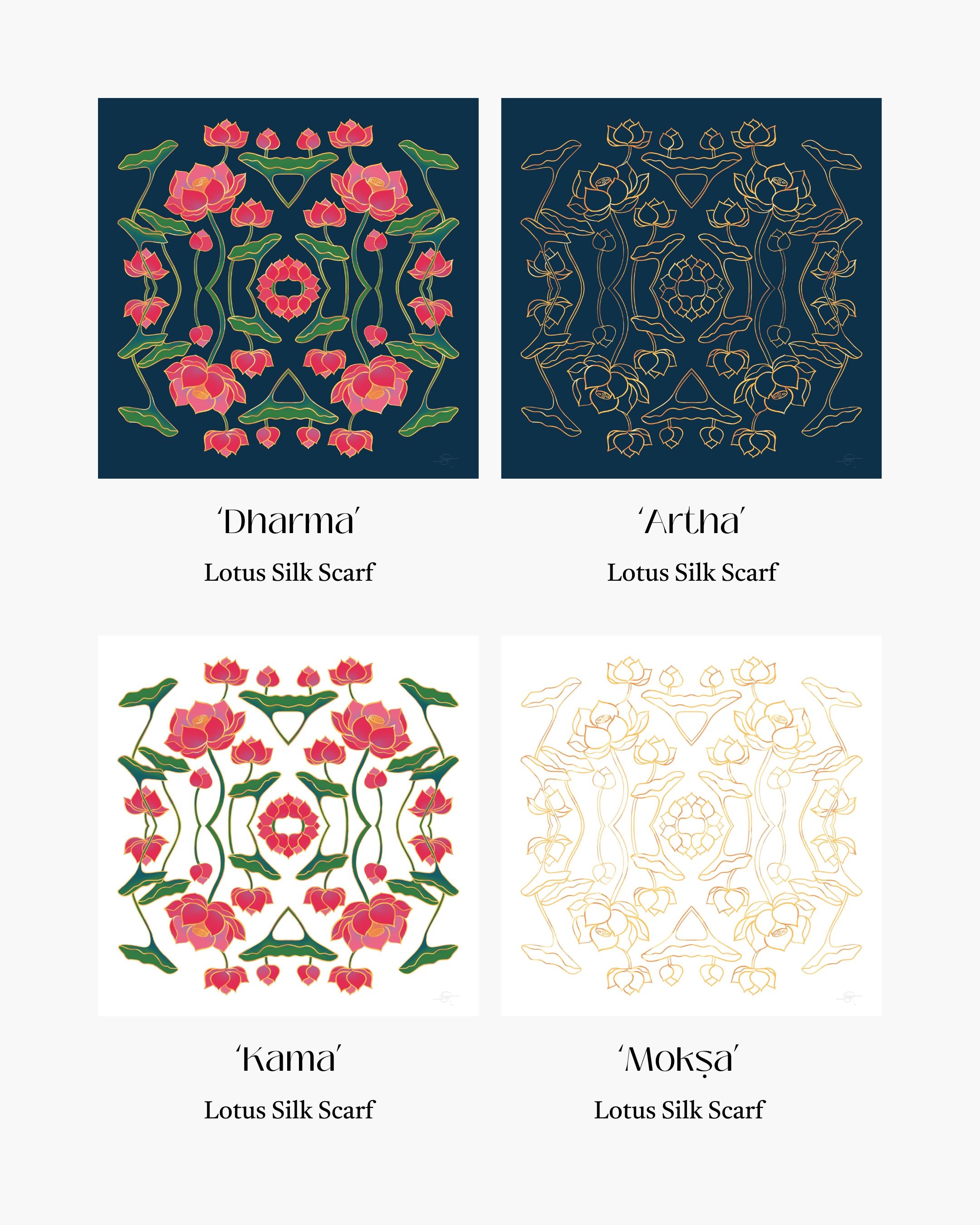 Lotus silk is one of the rarest fabrics in the world. The scarf features an original artwork from a four-piece series, each depicting a lotus grove outlined in luminous gold. The shifting colours represent the four aims (Puruṣārtha) of human life — Dharma, Artha, Kāma, and Mokṣa — while the lotuses symbolize the Ātmā (Soul/Self), constant and unchanging throughout.