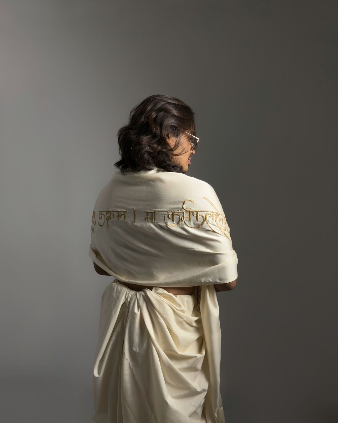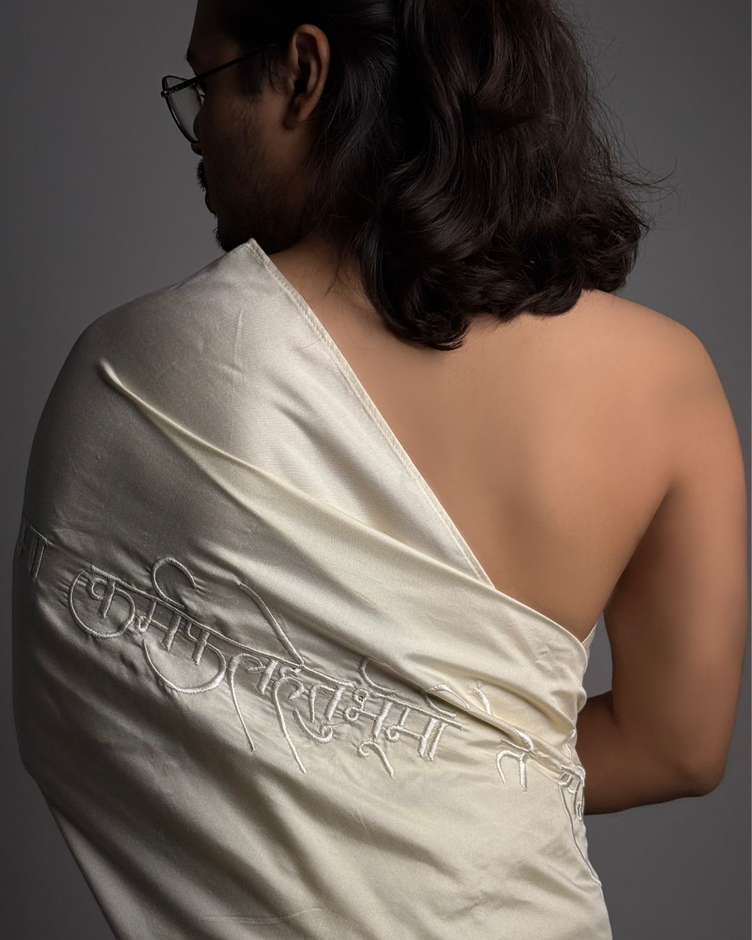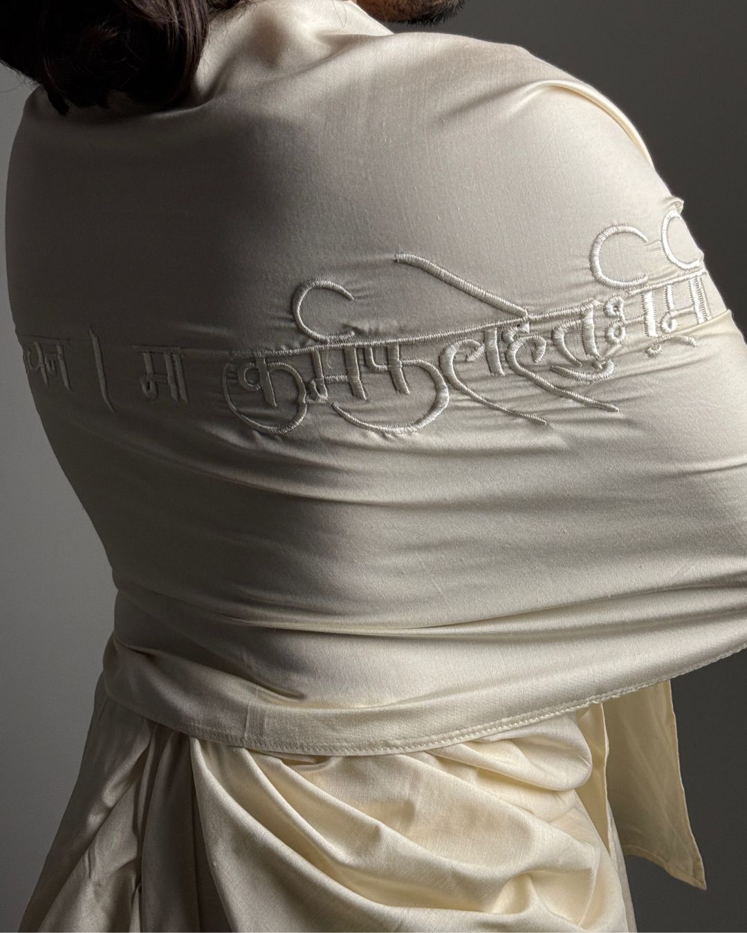 The uttarīya is a loose upper body garment that was worn by both men and women in ancient India. It is known to us as the angavastram/dupattā of today. This uttarīya is made with non-violent mulberry silk, one of the most luxurious fabrics in the world. Embroidered onto this garment is a sacred shloka from the Śrīmadbhagavadgītā — one of its most profound teachings, a whisper of eternal truth.