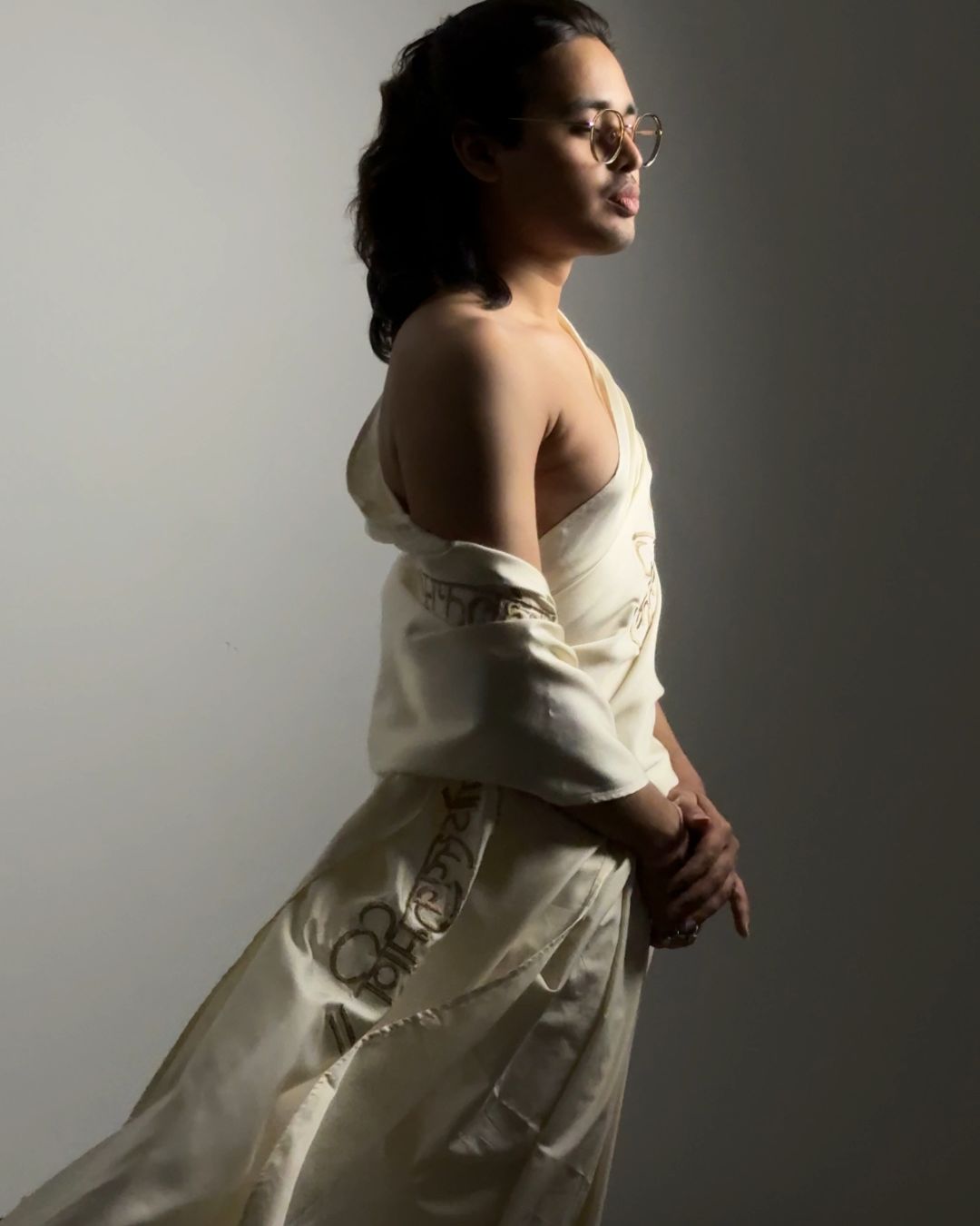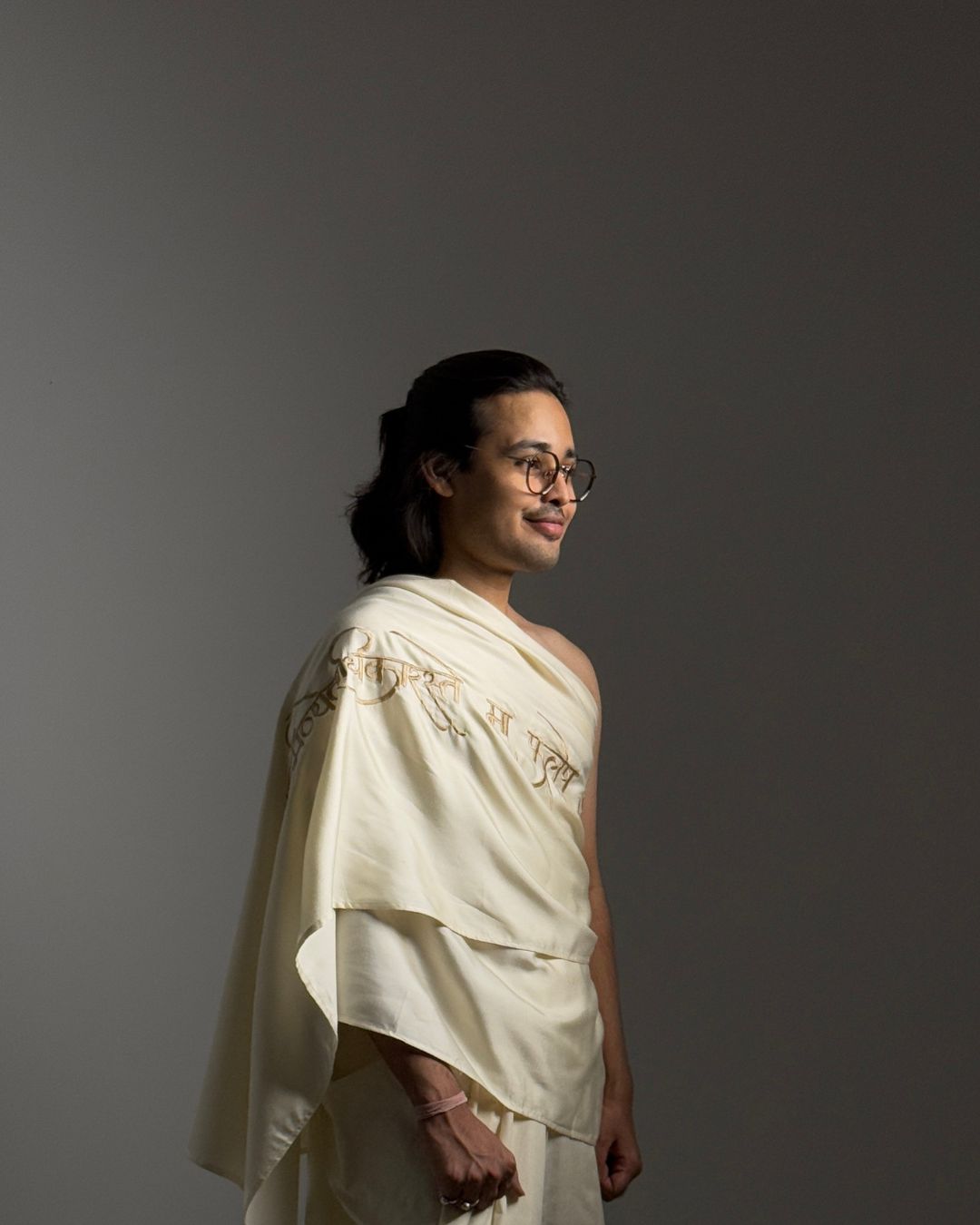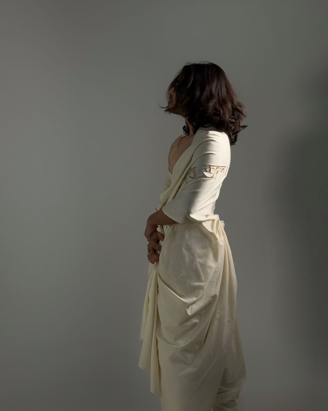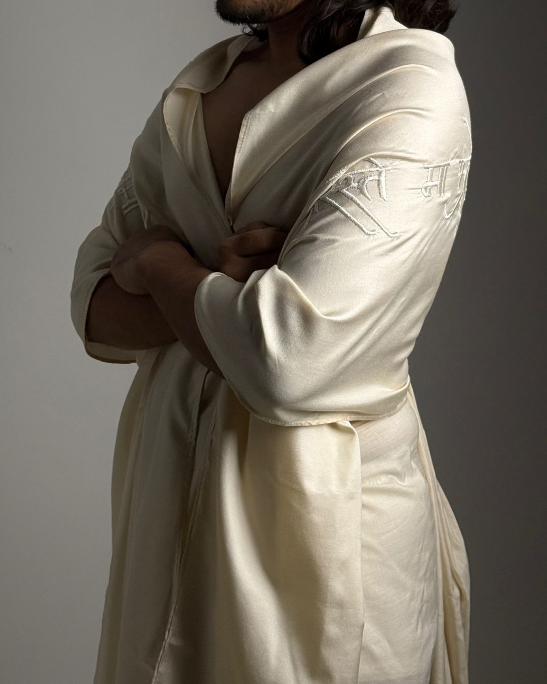 The uttarīya is a loose upper body garment that was worn by both men and women in ancient India. It is known to us as the angavastram/dupattā of today. This uttarīya is made with non-violent mulberry silk, one of the most luxurious fabrics in the world. Embroidered onto this garment is a sacred shloka from the Śrīmadbhagavadgītā — one of its most profound teachings, a whisper of eternal truth.