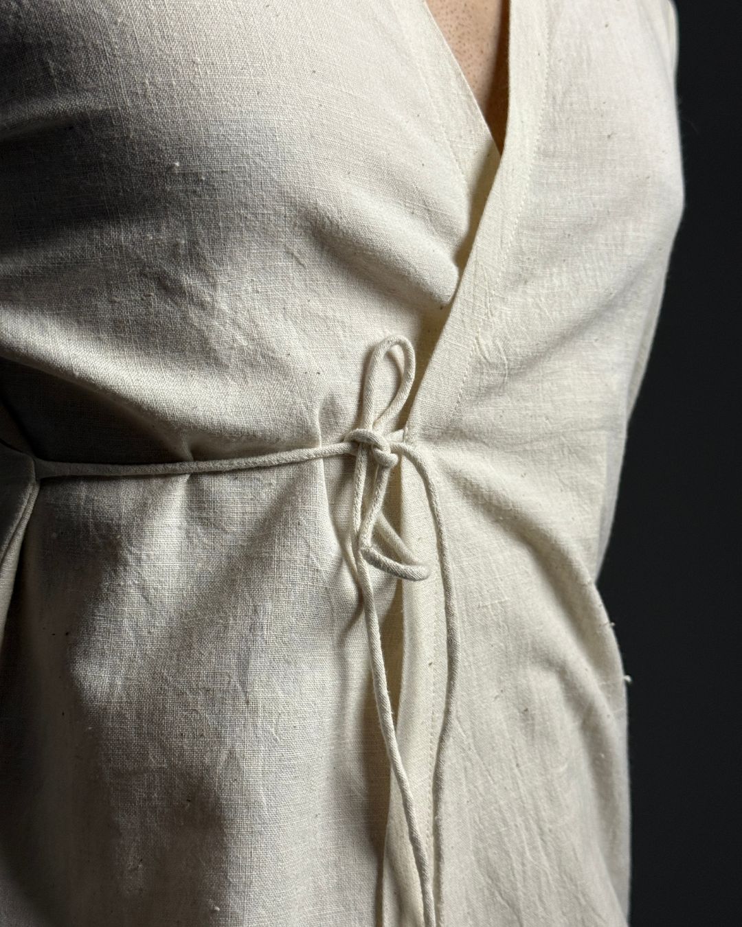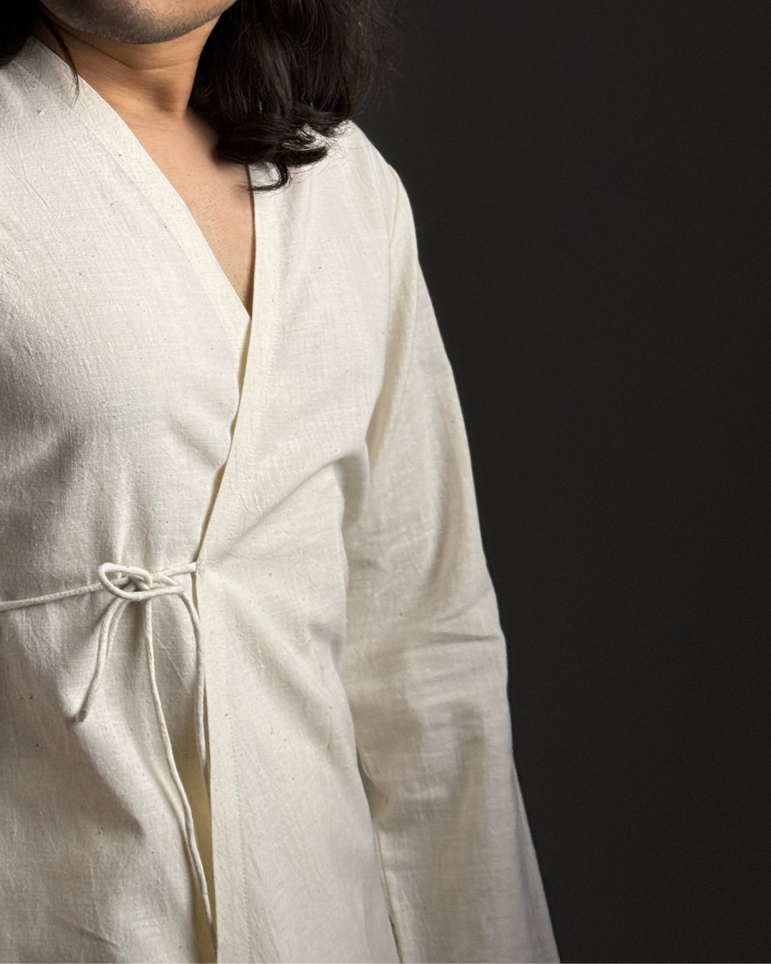 Custom tailored aṅgarakhā style shirt with an overlapping panel, two pairs of ties. Made with organic khadi cotton. Handwoven. Handcrafted by artisans in India.