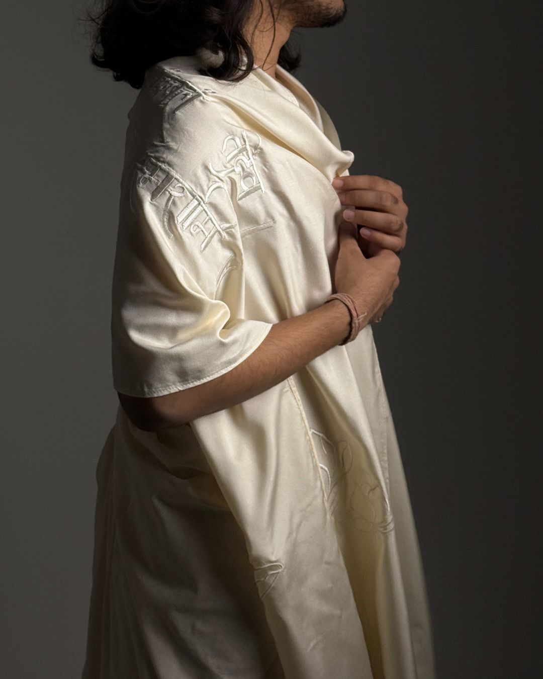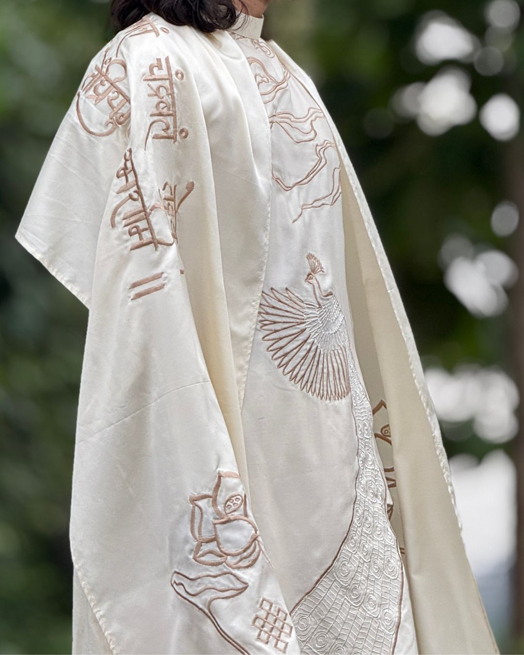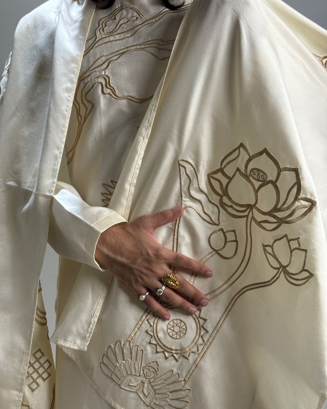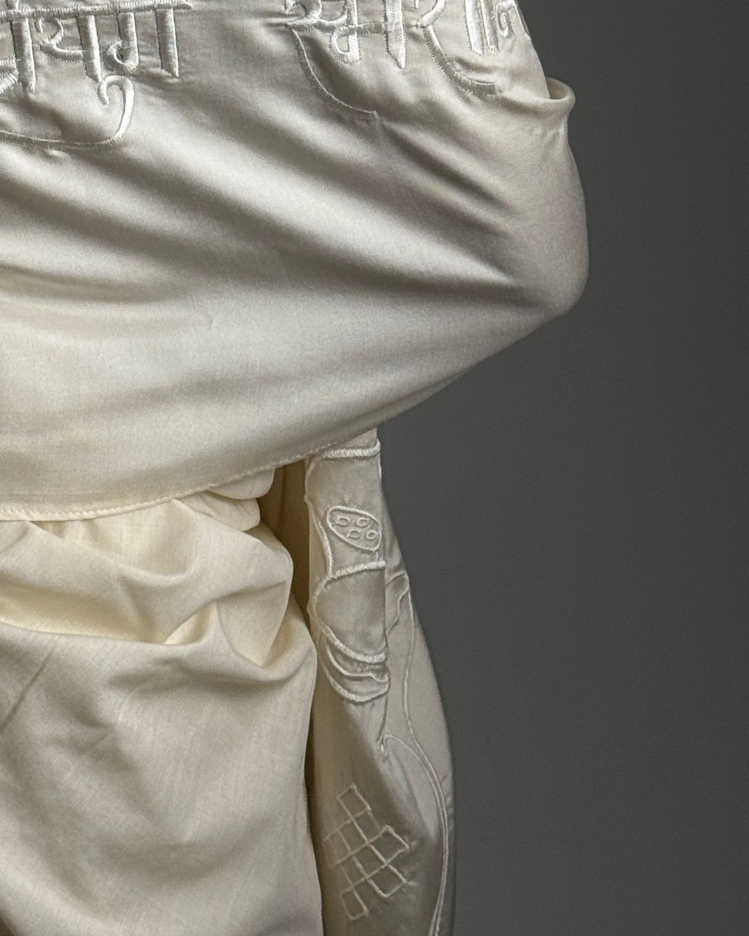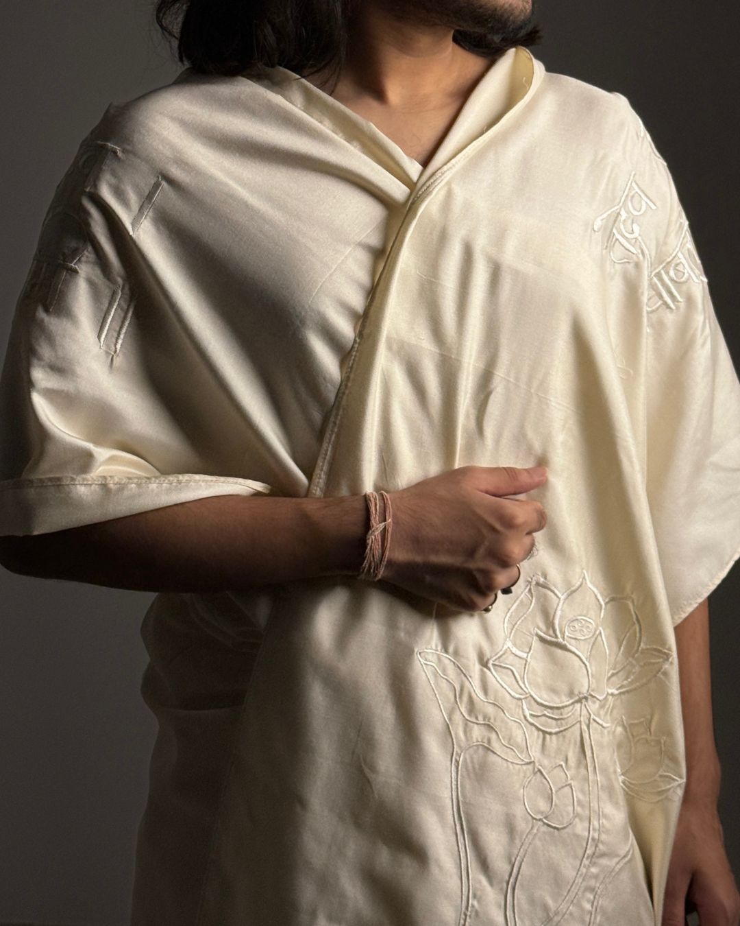 Rectangular loose upper body garment made with non-violent mulberry silk. Silk fibres harvested by hand. Handwoven. Hand finished by artisans. Embroidered with the auspicious marks of Viṣṇu - the Padma (lotus), the Śrīvatsa symbol, the Śankha (conch), the Gadā (mace), Ananta Śeṣa, the Sudarśanacakra, the Kaustubha gem, and Garuḍa deva. The calligraphy is hand-lettered. Embroidered with the shloka