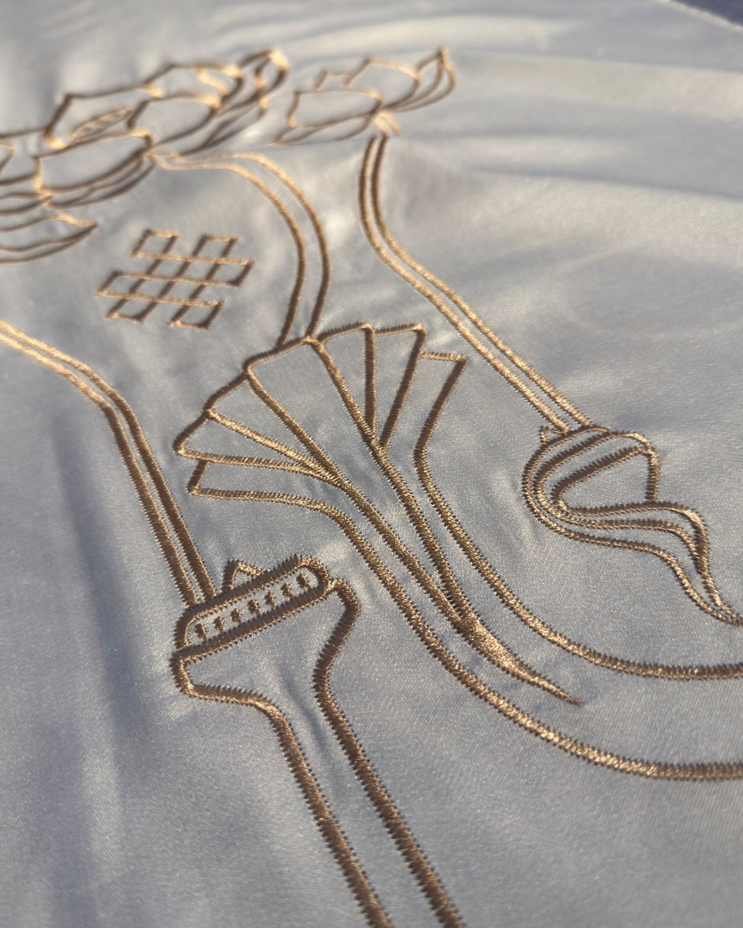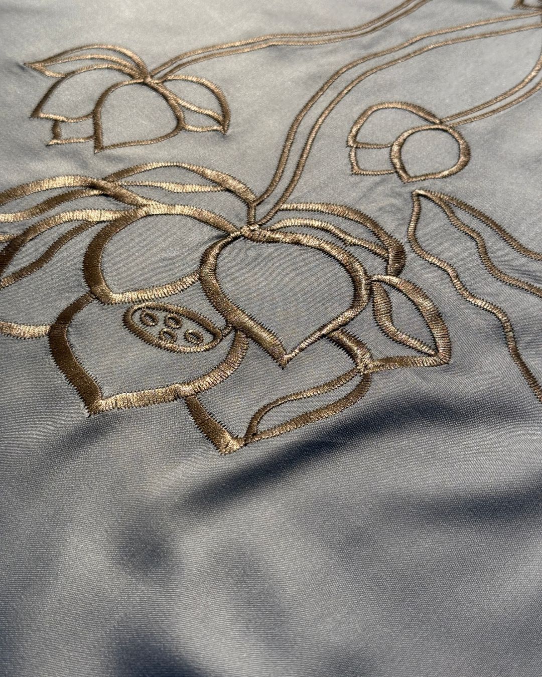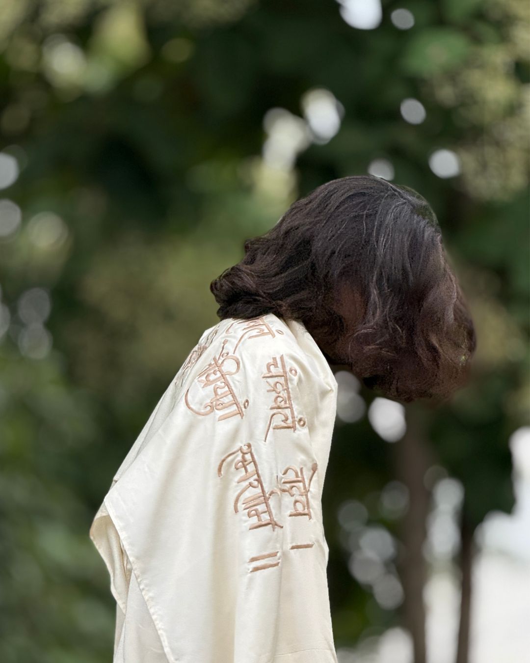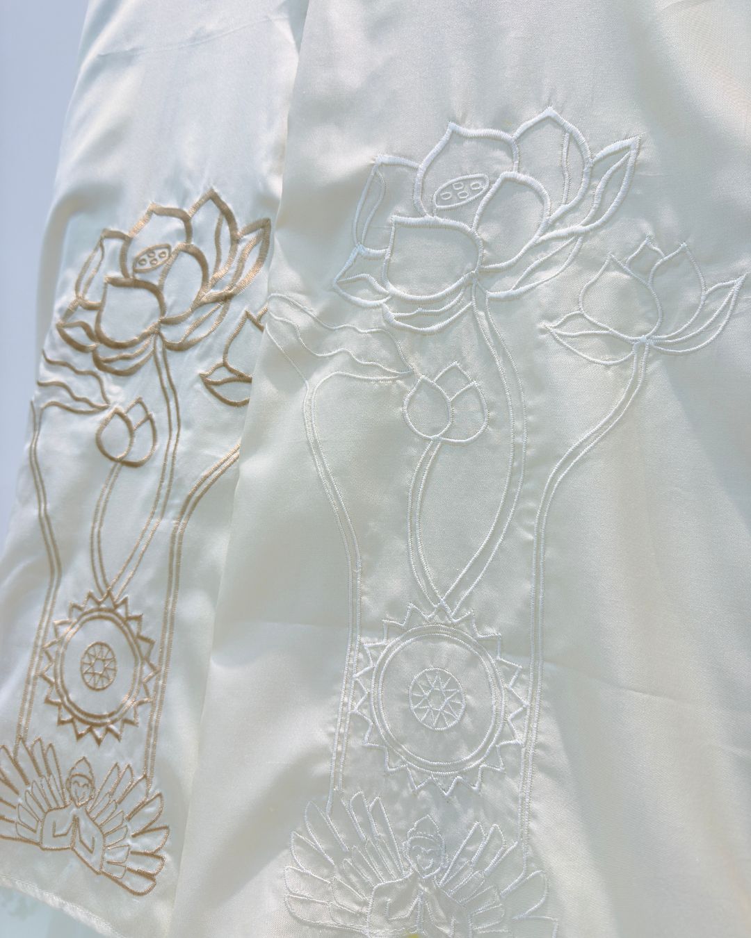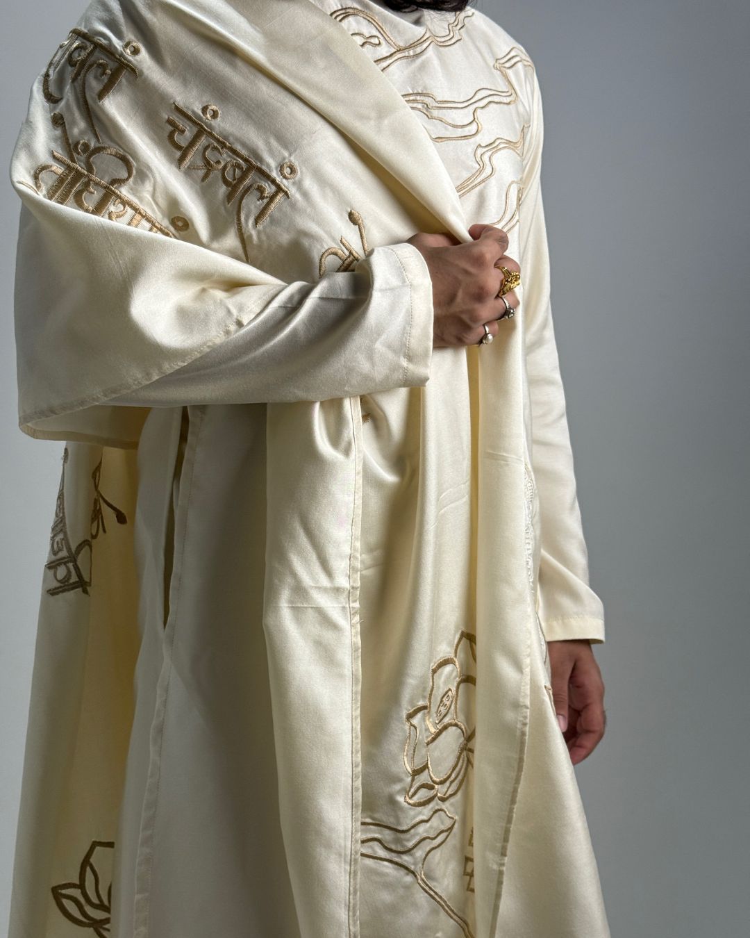 Rectangular loose upper body garment made with non-violent mulberry silk. Silk fibres harvested by hand. Handwoven. Hand finished by artisans. Embroidered with the auspicious marks of Viṣṇu - the Padma (lotus), the Śrīvatsa symbol, the Śankha (conch), the Gadā (mace), Ananta Śeṣa, the Sudarśanacakra, the Kaustubha gem, and Garuḍa deva. The calligraphy is hand-lettered. Embroidered with the shloka