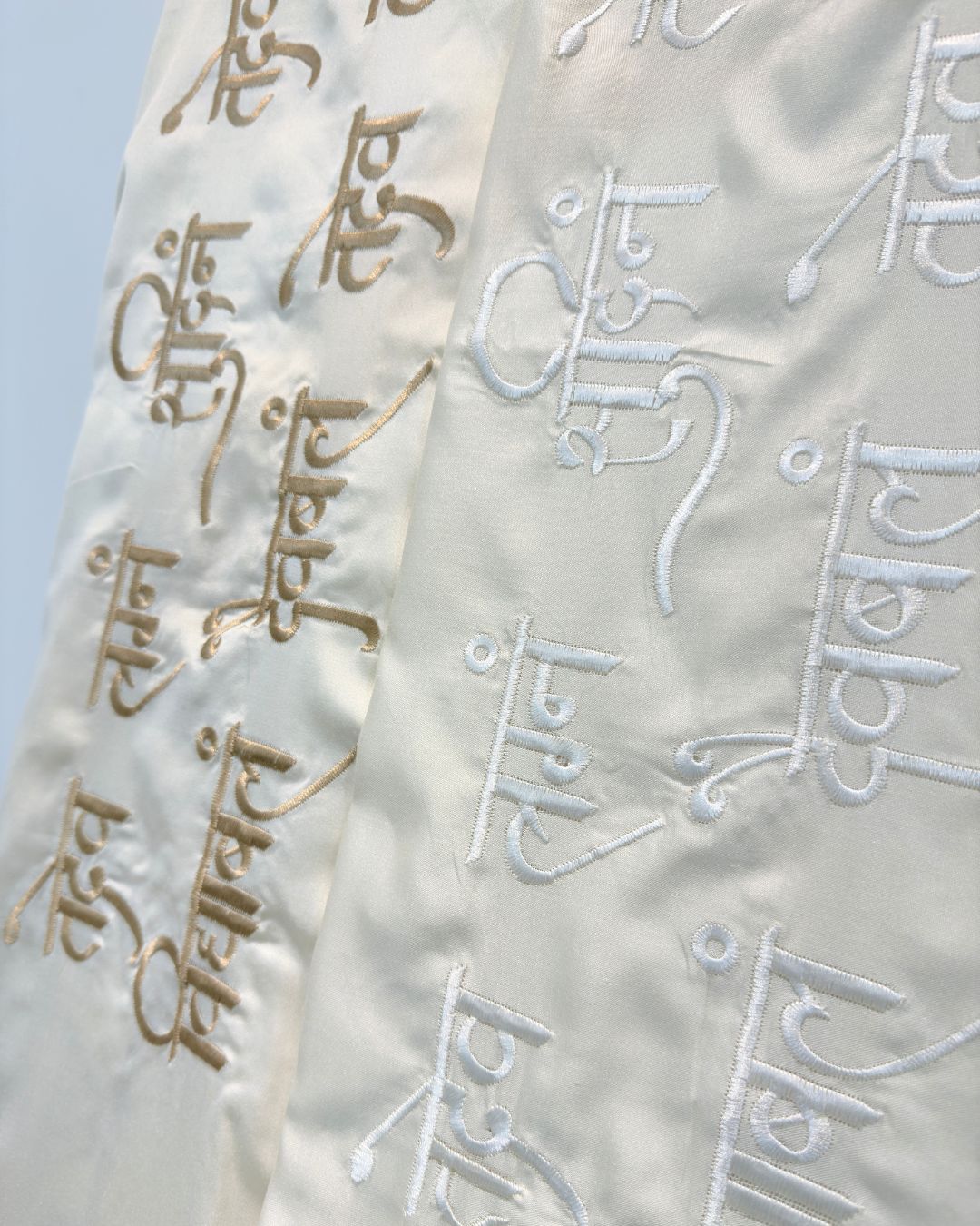 The uttarīya is a loose upper body garment that was worn by both men and women in ancient India. It is known to us as the angavastram/dupattā of today. This uttarīya is made with non-violent mulberry silk, one of the most luxurious fabrics in the world. Embroidered onto this garment is a sacred shloka from the maṅgalāṣṭaka, dedicated to Viṣṇu. Also embroidered on it are auspicious marks of Viṣṇu.