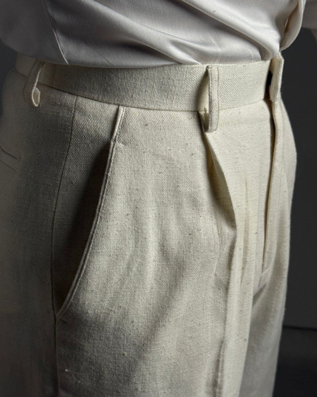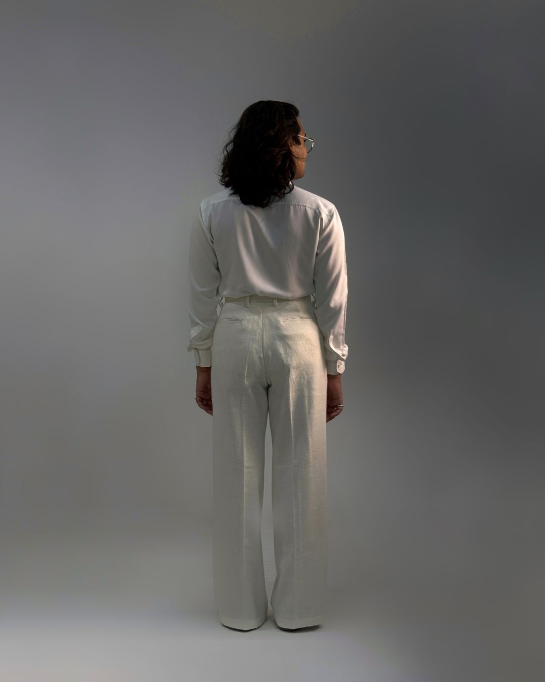 Custom tailored high-waisted, wide legged trousers. Made with khadi cotton. Handwoven. Handcrafted by artisans in India.